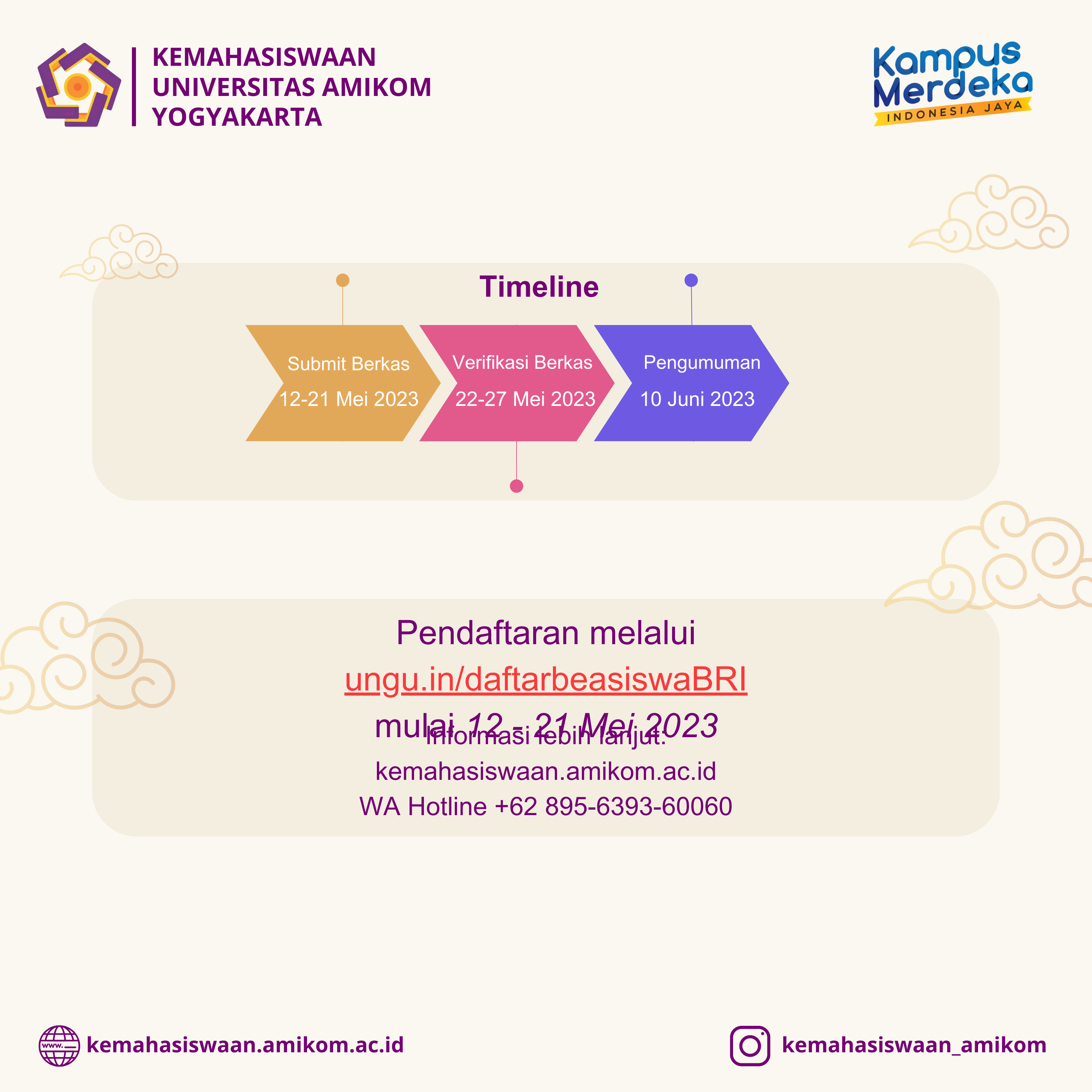 Universitas Amikom Yogyakarta membuka pendaftaran Beasiswa BRI 2023 bagi mahasisa aktif Universitas Amikom Yogyakarta. Yuk daftar dan cermati persyaratan nya ya.